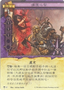 :检查一位目标对手的手牌。之后,你可以从那位对手的手牌中打出一个部队(只须支付它在卡牌上印制的费用,不用理会它的忠诚费用)到任何你的合法区域中并由你来控制它。